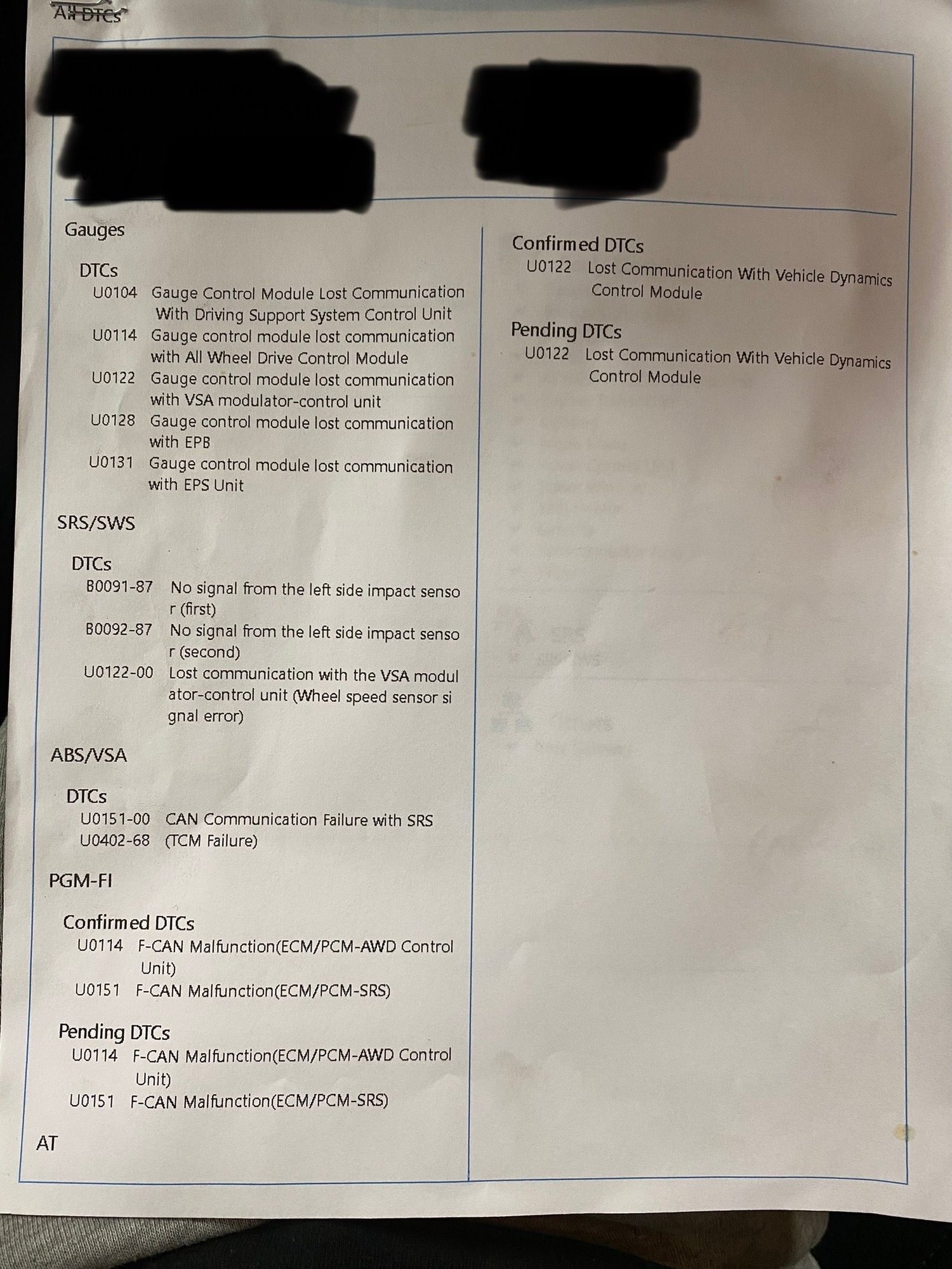 Recently purchased a 2019 crv salvage with body wiring harness melted together and shorted out a few modules and sensors. Looking for the location of my AWD control module. Location of SRS module. VSA module. List of all codes I currently have. I’ve replaced the body harness and all burnt fuses. Also replaced and programmed body control module and transmission control module. Any input would be greatly appreciated