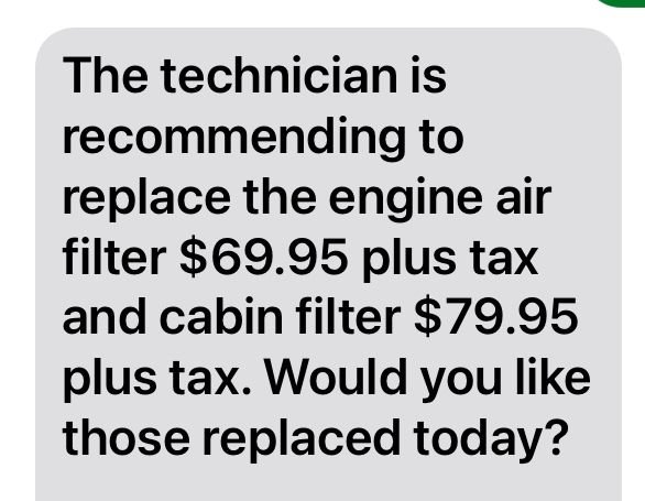 I just brought my 2018 CR-V in for an oil change after getting a maintenance alert on my screen for Code A 1 7. They later recommended that I replace both the Micron cabin filter for $79.95 and the Air filter condition? (Engine Air Filter) for $69.95. The car has 22,945 miles on it. Thinking about things a bit more I had detected an odor in the car recently so I purchased some air fresheners that slide into the A/C vents to correct a musty smell that I thought was caused by all the summer humidity we get down here in SC.