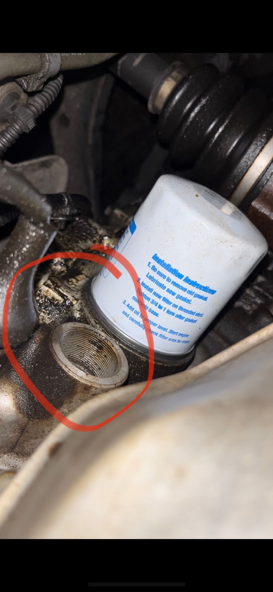 When I looked at the oil filter from the top of the engine I see that’s there as well, but there is a hole just above it where it looks like a bolt or something should connect and there is oil everywhere.