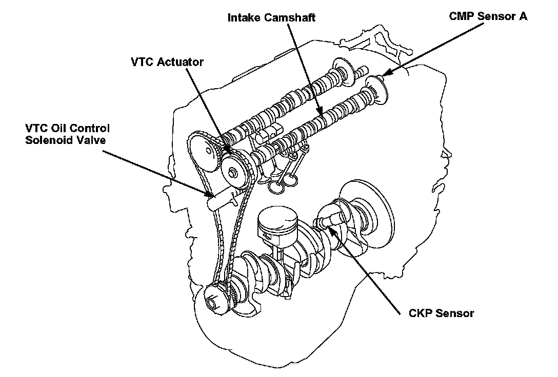 Camshaft position (CMP) sensor A detects the intake camshaft timing and sends pulsing signals to the powertrain control module (PCM). The PCM determines the advance or the retard of the camshaft timing according to the signals from the crankshaft position (CKP) sensor and CMP sensor A. If the pulse deviates from a set range over a specified time period while the variable valve timing control (VTC) is not activated, the PCM detects a malfunction and stores a DTC.