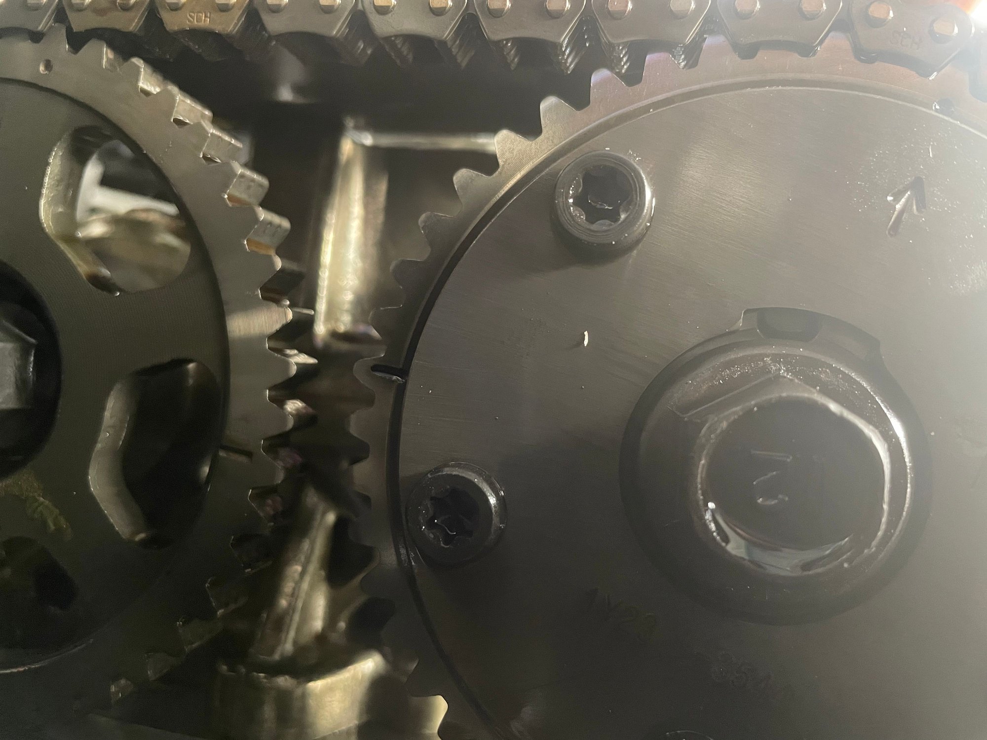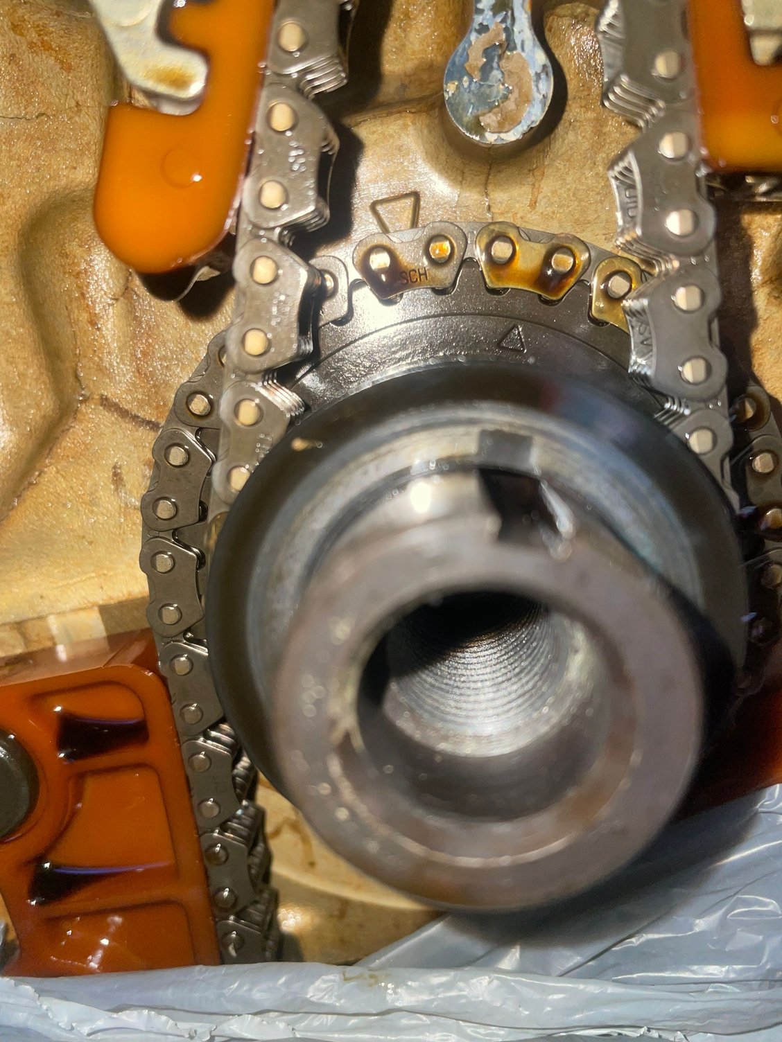 so I was able to break my vtc actuator bolt loose but I think in the process it jumped timing which is no big deal but not when I go to rotate engine back to tdc I can feel binding so I don’t want to force anything also I think the actuator may have unlocked it self when the bolt came loose now I’m wondering what the best way to get this back in time is the tensioner and chain are till attached to engine I have new ones I’m going to be re installing but I need to figure out how I can get the marks back on time here’s a few pictures.. I am working on the car rn so an answer asap would be really appreciated!!