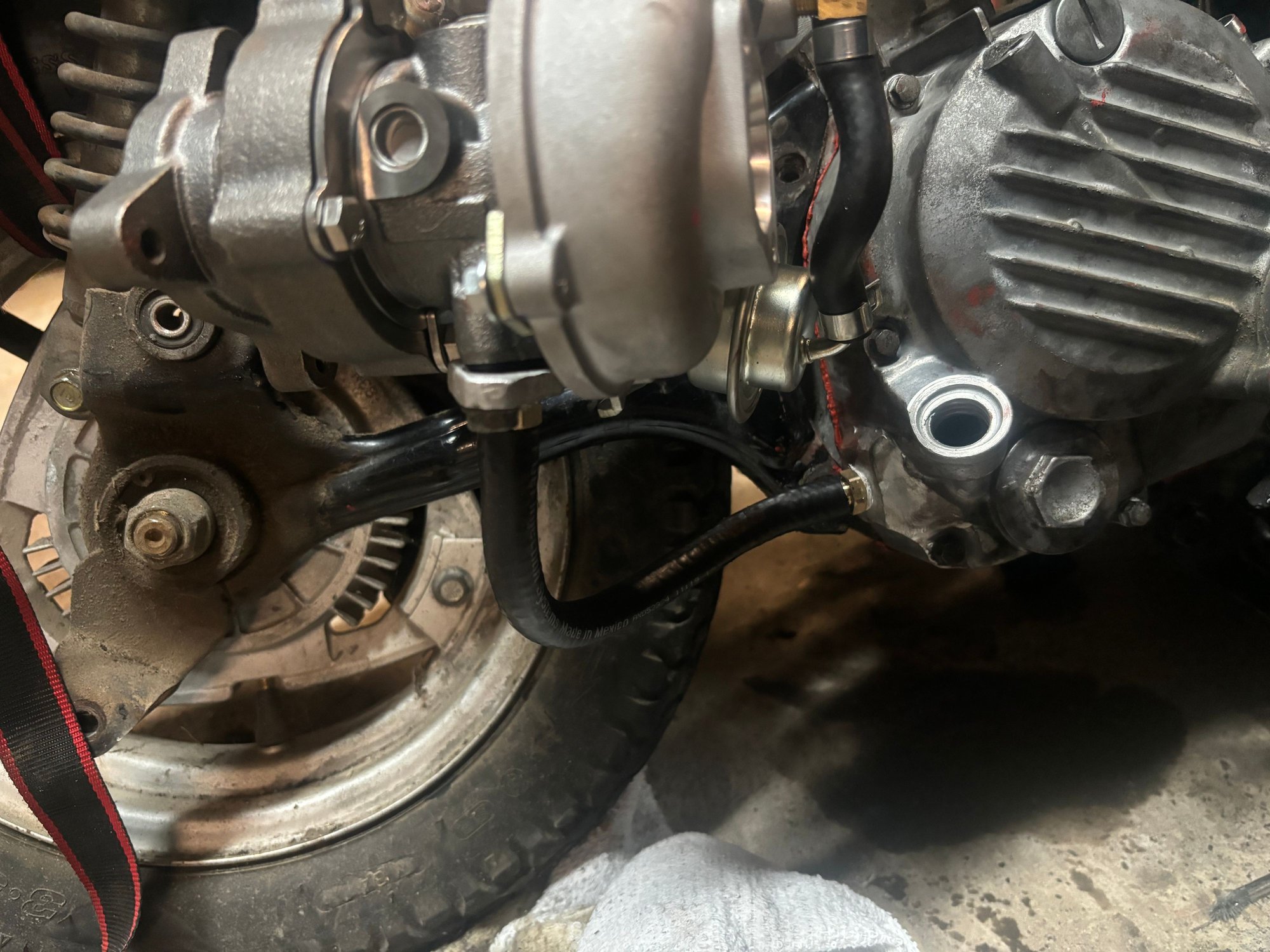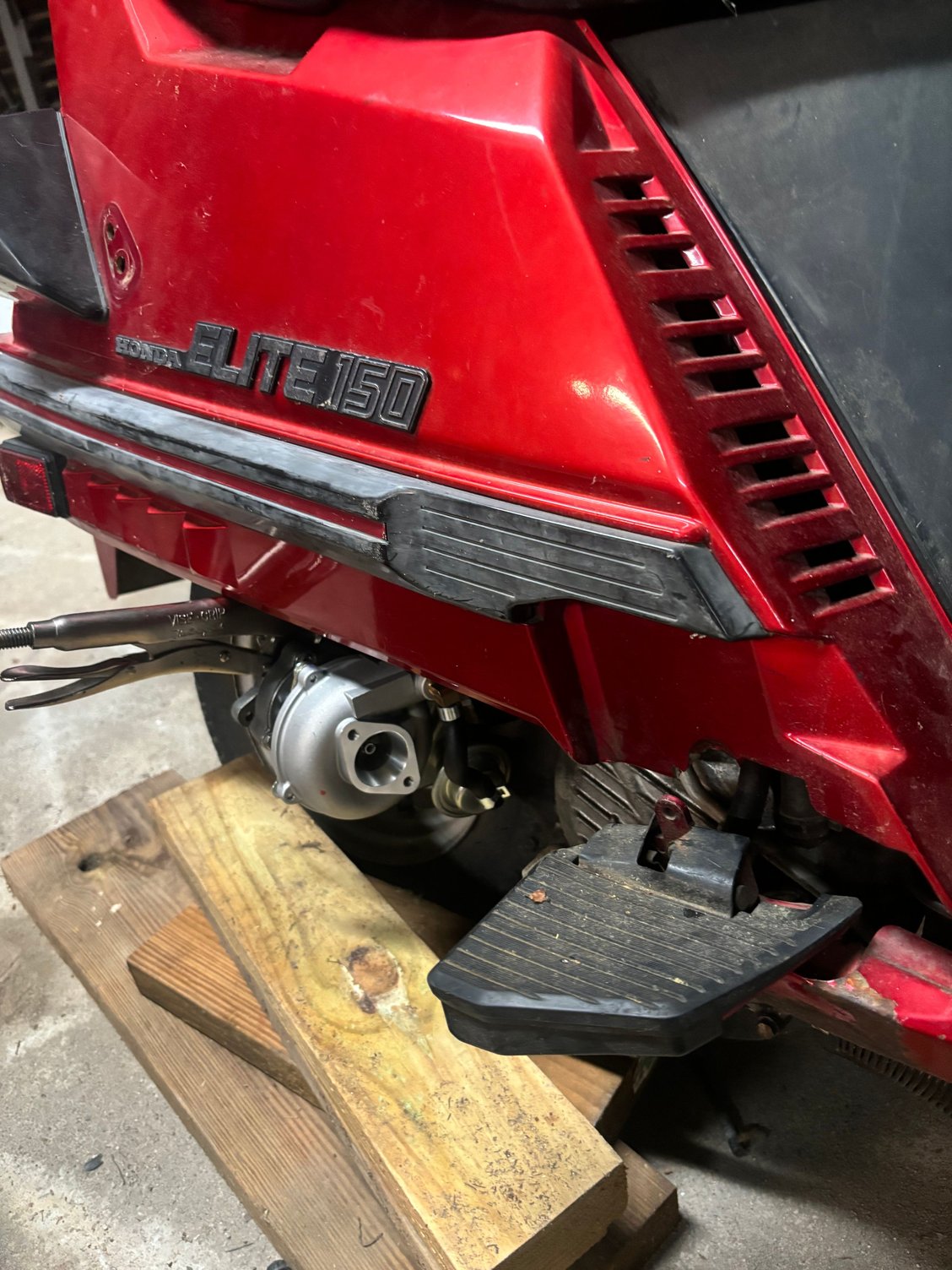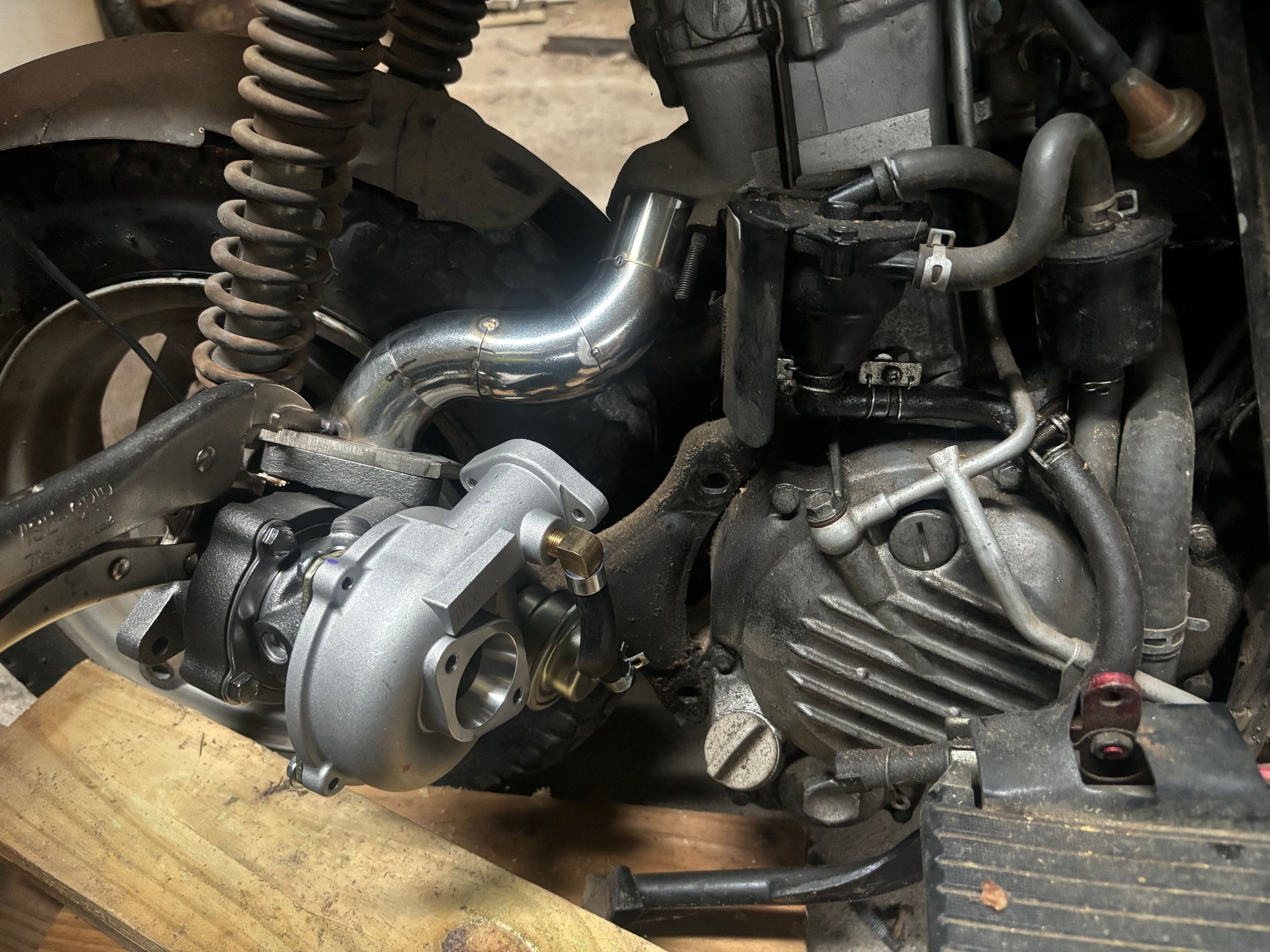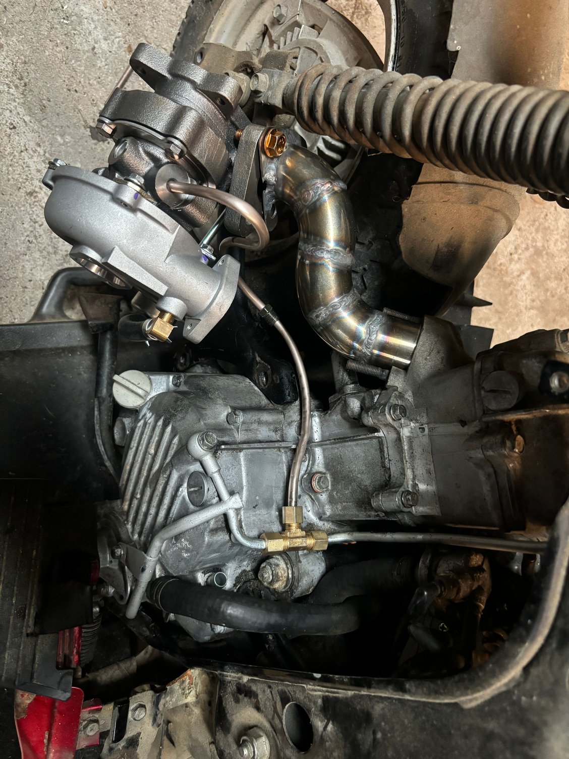 The post is worded performance ch150 because for years everyone has been saying that there is no way to modify these great scoots. Well guys I got news for you. A new era is among us and it’s gonna be a fun one! What you’re looking at here is a tiny TURBO on an 85 ch150. All the work was done in my home shop over the past 4 months or so. This unit is going to be running a Honda grom throttle body and intake, I custom made an intake adapter for the grom throttle body to clear the thermostat housing. It has an ls style coil because the fueltech won’t run the old style coil. It gets its brain from a fueltech ft450 Ecu with a wideband so it can self tune! All the hot side piping is stainless. All the boost piping is aluminum. Factory throttle cable works with a little modification of the grom throttle bracket. Oil feed is from the external oil lines that run to the head, oil return was drilled and tapped into the crank case. Factory crank trigger is compatible with the new efi system. This is a test to make proof of the concept then that’s where we start to go crazy. I have a complete spare motor that I’m going to attempt to build. A few spare heads and cams also so I will be custom grinding my own cams and again trying to see if I can build a cool bottom end.