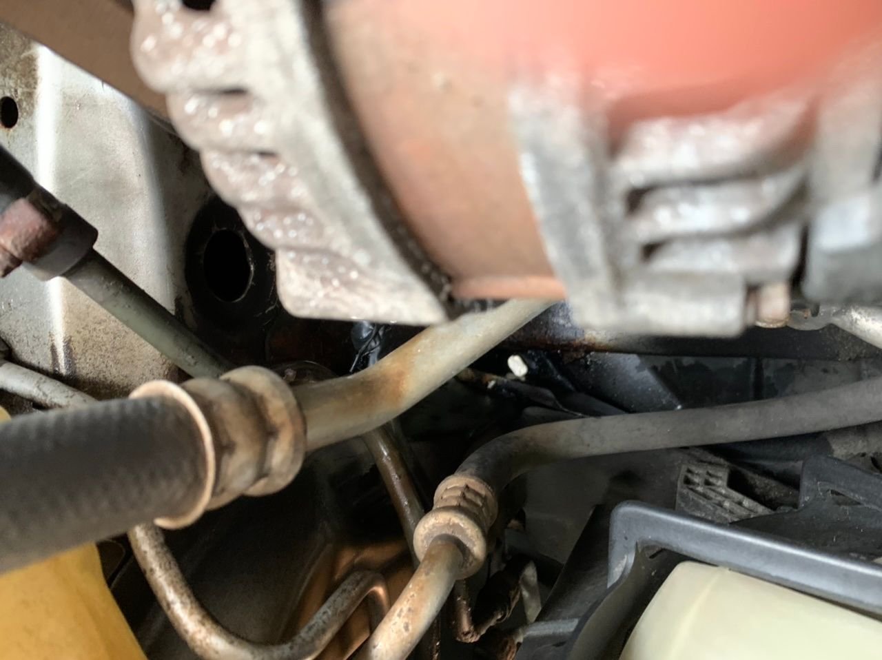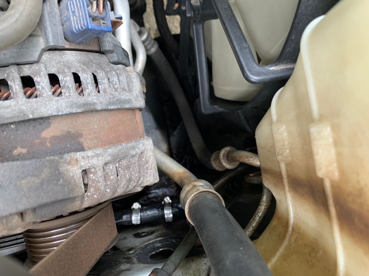 Hi guys so. My power steering was making a really bad whining noise and realized my power steering fluid was low so I figured just fill it up and it’s good well no. 1 hour later it was empty again. I found a leak it’s on a metal line towards the bottom. I called autozone and they said there is a low pressure line and a return line but I’m not sure which one it is! I took pictures I hope you guys can make it out it’s a