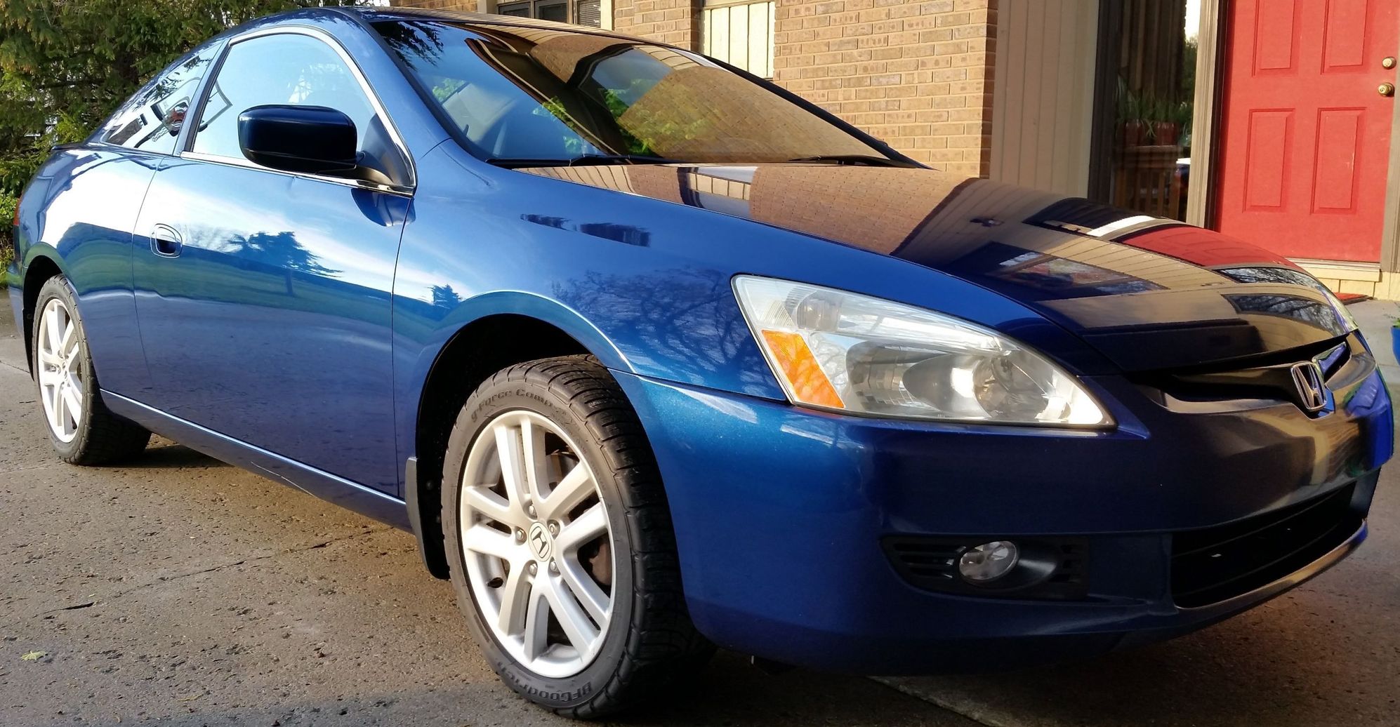 For Sale: 2004 Honda Accord Coupe, V6, 6-speed manual, EX-L, $5,900. NE Indiana, 46845. Original Owner, 119,940 Miles, Mechanically Excellent Shape. Very desirable color combo: Saphire Blue with Black leather. Black Leather Interior in Excellent shape. Moonroof, rear spoiler, fog lights, power windows, power locks, tilt & telescope steering wheel, power driver’s seat, 6 disc in dash CD player. OEM front all season floor mats, OEM carpet front & rear floor mats, OEM rear trunk tray. OEM Splash guards only 3, one was destroyed by tire shop & no longer available from Honda. Full Synthetic Oil changes done every 5K miles, I have All maintenance & repair history as I bought this car new in April 2004. Only modifications are all Honda Corp. parts, with installing Acura TL Limited Slip differential & larger Acura TL rear sway bar. I hate to sell this very rare Accord with V6 & 6-speed manual transmission. I don’t drive it enough and I want this rare Accord to go to a good owner that will appreciate this awesome Honda. Comes with a 4 winter tires & 16 inch Aluminum wheels. Minor issues: small amount of rust on left rear quarter, some clear coat coming off front bumper cover, small ding on right door, deep scratch on right rocker panel, rear bumper cover had small damage & paint color is darker than original paint despite using OEM Honda paint. Those minor issues is why it is not priced @ $8K. Payment: Certified Check, No Trades, No low ball offers & I don’t need help selling this car. Please don’t take offense, but No Joy riders & Only experienced manual transmission drivers. Please contact me with any questions and I will be glad to tell you about this awesome Accord.